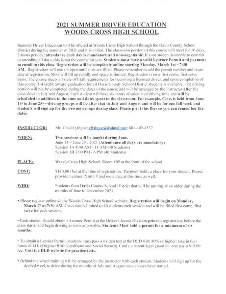 Woods Cross High SchoolStudents must have a valid Learner Permit before enrolling in this class. YOU MUST ENTER THE PERMIT NUMBER AND ISSUE DATE IN THE COMMENT SECTION UPON CHECK OUT OR YOU WILL NOT BE GUARANTEED A SPACE IN THE CLASS!!! Space is limited and is first come, first serve. Summer Driver Education will be offered at Woods Cross High School through Davis County School District during the summer of 2021. The classroom portion of this course will meet for 9 days, 3 hours per day. Attendance each day is mandatory and non-negotiable. If your student is unable to commit to attending all days, this is not the course for you. The course meets all state of Utah requirements for becoming a licensed driver, and upon completion of this course 1/4 credit toward graduation for all Davis County School District students is available. The driving portion will NOT be completed during the dates of the course and will be arranged by the instructor after the class dates in July and August. Each student will have six hours of calculated driving time in addition to the time and dates spent in the classroom. Students will sign up for the driving groups during class.