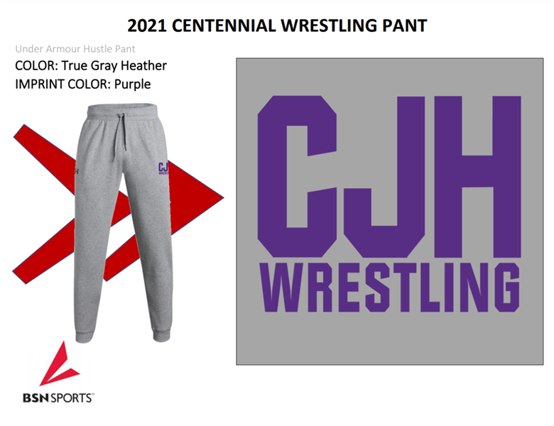 Centennial Jr HighWe are selling Wrestling T-shirts, Sweat Pants, and Hoodies. The T-shirt is a Vintage Black Next Level Short Sleeve Shirt with purple & white lettering and will sell for $11. The Sweat Pants are a True Heather Gray Under Armor Hustle Pant with purple lettering. that will sell for $32. The hoodie is a True Gray Heather Under Armor Hustle Hoody with purple and white lettering that will sell for $32. Wrestlers will be receiving a T-shirt and Sweat Pants as part of their paid wrestling fees. Anticipated delivery of apparel will be mid March. Please include student name in the comments section to ensure proper delivery of your order.