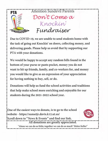 We promise not to come a knockin'. Due to COVID-19, we are unable to send students home with the task of going out knockin' on doors selling, collecting, and delivering goods. We are asking for donations to be used to fund the many activities that help support the school and students to have a more enjoyable year for the 2021-2022 school year. We appreciate any donation you may be able to make.