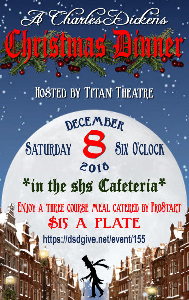 Syracuse High SchoolJoin us Saturday, December 8th at 6:00 p.m. for an interactive dinner theater performance based on the favorite holiday classic "A Christmas Carol". Tickets include admission to the show, adapted and performed by Titan Theater students, and a Christmas dinner, catered by the Syracuse High School ProStart students. The dinner will include a salad, main course, dessert course and drinks. This event will be held in the SHS cafeteria. Tickets are $15 a plate with all proceeds going to support Titan Theater. This is an event you don't want to miss!