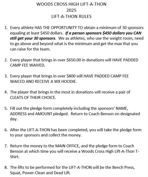 Sponsor a WXHS Football player by making a donation to the Lift A Thon. The lifts to be performed for the LIFT-A-THON will be the Bench Press, Squat, Power-Clean and Dead Lift. LIST THE PLAYERS NAME IN THE COMMENT BOX AT CHECK OUT.