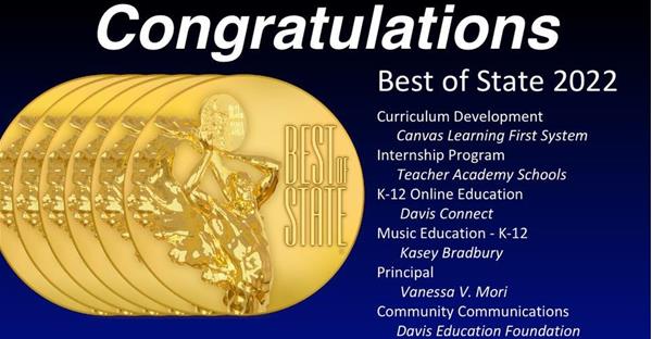 Davis ConnectCongratulations to Davis Connect for winning the 2022 BEST OF STATE K-12 Online School Award for the 2nd year in a row! Each Davis Connect educator will have a ticket purchased by Davis Connect. Educators can purchase ONE guest ticket at the price of $119 each. The Awards Gala features a double entrée dinner, live entertainment, and celebrity presenters. Medals will be presented to all Best of State winners, and ten winners will take home a Best of State Statue--the BOSS®. Event Date: Thursday, May 26, 2022 Time: Registration/Reception begins at 5:30 p.m., event doors open at 6:00 p.m., event starts at 6:30 p.m. Place: Salt Palace Convention Center Grand Ballroom, Salt Lake City Attire: Formal, Black tie preferred Cost: $119.00 per seat