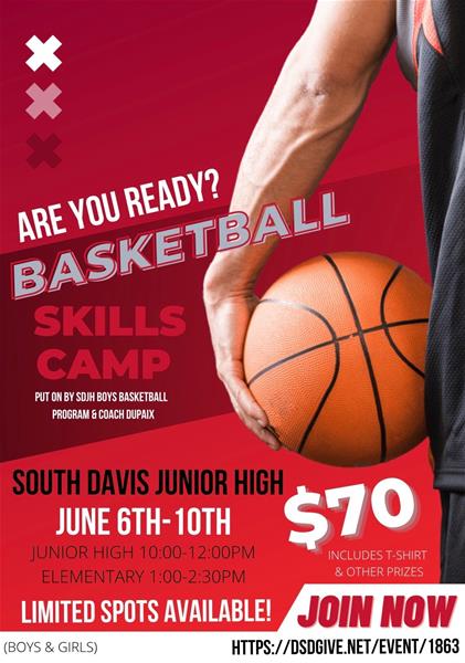 South Davis Jr HighAre you ready? Basketball skills camp with Coach Dupaix! Camp fee includes a t-shirt and prizes. Money raised will go towards basketball equipment and salaries for coaches Elementary camp June 6-10 1:00 p.m. to 2:30 p.m. Jr High camp June 6-10 10:00 a.m. to 12:00 noon