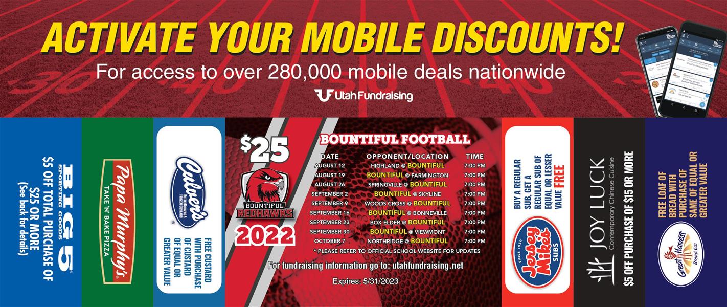 Bountiful High SchoolBountiful Football Family: Please help us raise the necessary funds to ensure we have a successful season by purchasing a Bountiful Football Discount Card. This card can be used at many locations including Jersey Mike's, Panda, Cold Stone, Bountiful Bowl, and Spanky's just to name a few! Your support will be used for uniforms, travel, equipment and team meals. The costs to run our program continue to rise and we are looking to our families, friends, and community for help. Please take a couple minutes to make a purchase; every purchase makes a difference. Thank you for your support! Go Redhawks! IMPORTANT: PLEASE PUT THE NAME OF THE FOOTBALL PLAYER WHO CONTACTED YOU IN THE "COMMENTS" SECTION!