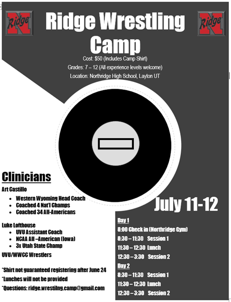 Northridge High SchoolDate- July 11-12 Price- $50 (includes camp shirt) No refunds. Register by June 30 to guarantee a camp shirt. Grade- 7th-12th Location- Northridge High School 2430 N. Hill Field Rd. Layton, Ut. 84041 We are excited to get our inaugural Ridge Wrestling Camp underway with some great clinicians! We are grateful to have the Head Coach of Western Wyoming Community College and the Assistant Coach of Utah Valley University. Both programs recruit a lot in northern Utah, so this is a great way to learn from great coaches/wrestlers, while building a relationship with them. They will also be accompanied by current college wrestlers.