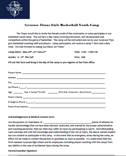Syracuse High SchoolThe Titans would like to invite the female youth of the community to come participate in our basketball youth camp. This will be a 3-day camp involving instruction, skill development and competition within the game of basketball. The camp will be instructed and ran by your Syracuse Titan girls basketball coaching staff and players. Camp participants will receive a camp T-Shirt and a daily treat. We look forward to seeing you there, Go Titans! May 20th, 21st & 22nd 5:30-7:00 p.m. Grades K-8 This Fall. All participants are required to fill out this form and return it to the office or bring it the first day of camp!