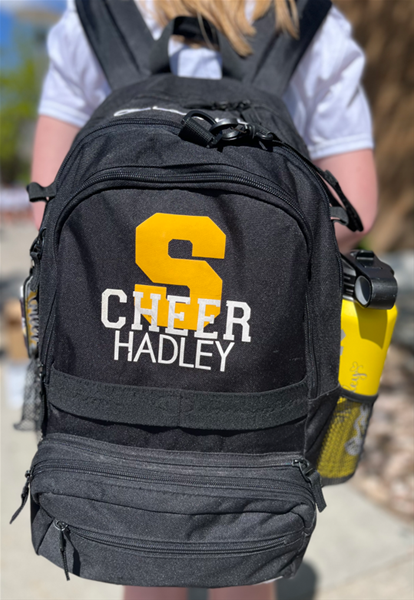 Sunset Jr HighChampion Brand Backpack Detail: - 2 large zippered compartments and 1 front zippered pocket - Small detachable front pocket with 2 compartments. This can be detached to convert into a fanny pack or crossbag. - Padded interior laptop sleeve - 2 mesh side pockets - Looped elastic on sides and front for external storage - Padded adjustable shoulder straps - Customized with your first name, the letter S, and Cheer