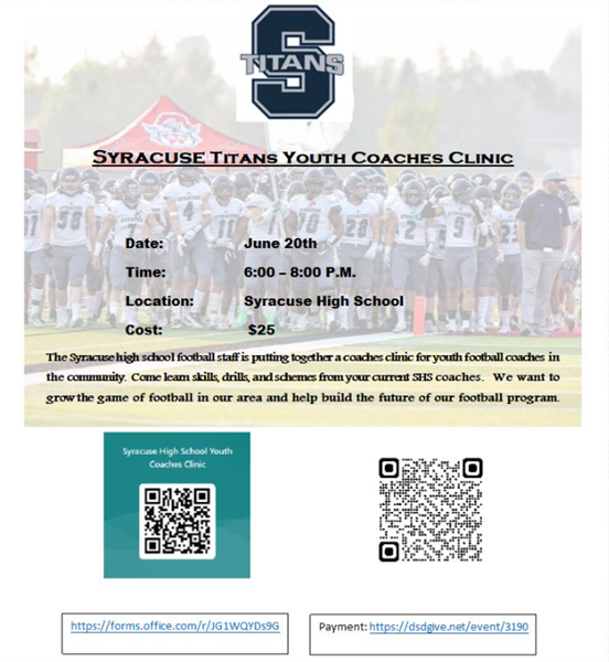 Syracuse High SchoolSyracuse Titans Youth Coaches Clinic Date: June 20th Time: 6:00-8:00 p.m. Location: Syracuse High School Cost: $25 The Syracuse high school football staff is putting together a coaches clinic for youth football coaches in the community. Come learn skills, drills, and schemes from your current SHS coaches. We want to grow the game of football in our area and help build the future of our football program. Registration is a 2 step process- 1. Pay here. 2. Register for the clinic using the QR code below. ***Registration is not complete until both steps are completed.*** The schedule for the day is attached.