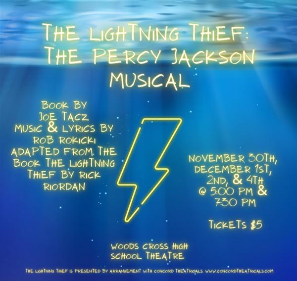 Woods Cross High SchoolAs the half-blood son of a Greek god, Percy Jackson has newly discovered powers he can't control, a destiny he doesn't want, and a mythology textbook's worth of monsters on his trail. When Zeus's master lightning bolt is stolen and Percy becomes the prime suspect, he has to find and return the bolt to prove his innocence and prevent a war between the gods. But to succeed on his quest, Percy will have to do more than catch the thief. He must travel to the Underworld and back; solve the riddle of the Oracle, which warns him of betrayal by a friend; and come to terms with the father who abandoned him. Adapted from the best-selling book The Lightning Thief by Rick Riordan and featuring a thrilling original rock score, The Lightning Thief: The Percy Jackson Musical is an action-packed mythical adventure "worthy of the gods" (Time Out New York). Performance by the 4th-period cast Concessions available for purchase; No photography or video recordings allowed