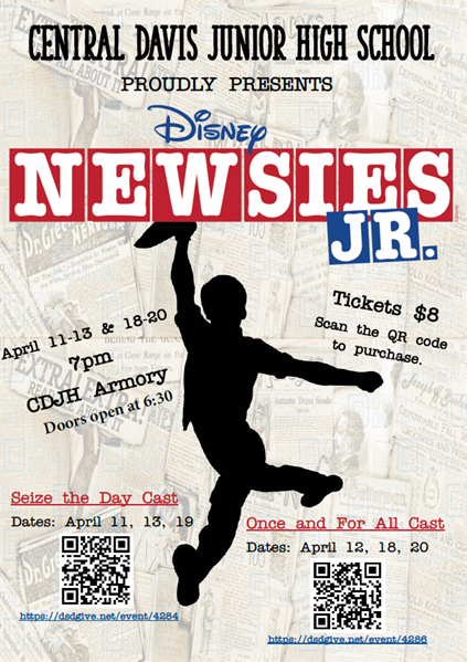 Central Davis Jr HighCDJH is proud to present the musical Newsies! Based on the real-life Newsboy Strike of 1899, this Disney musical tells the story of Jack Kelly, a rebellious newsboy who dreams of a life as an artist away from the big city. After publishing giant Joseph Pulitzer raises newspaper prices at the newsboys' expense, Kelly and his fellow newsies take action. Please see the cast lists below if you want to see a specific student as there are 2 casts and each cast performs on different nights. All tickets are 8 dollars and performances are at 7pm in the Armory building behind CDJH.