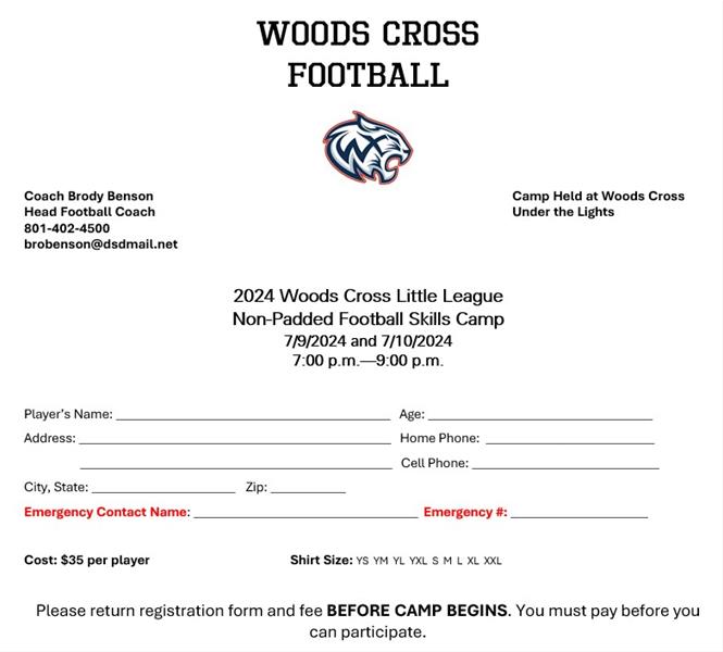 Football Little League Non-Padded Skills Camp IN COMMENTS PLEASE PROVIDE: Players name and T-shirt size Coach Benson email brobenson@dsdmail.net *See Flyer for information**