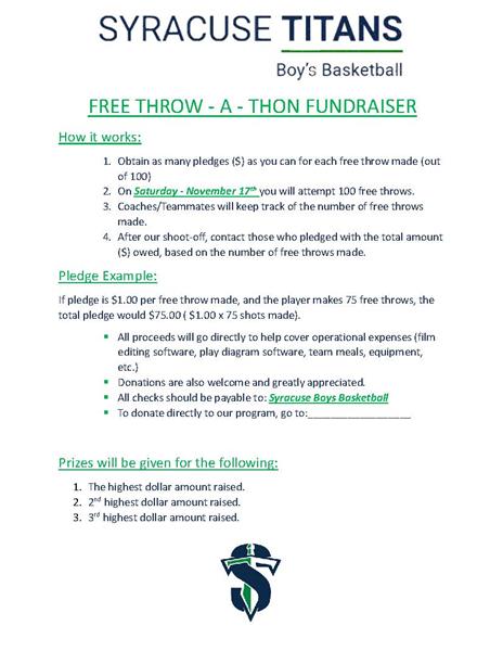 Syracuse High SchoolSyracuse Titans Boy's Basketball Free Throw-A-Thon Fundraiser. How it works: 1. Obtain as many pledges ($) as you can for each free throw made (out of 100) 2. On Saturday - November 17th you will attempt 100 free throws. 3. Coaches/Teammates will keep track of the number of free throws made. 4. After our shoot-off, contact those who pledged with the total amount ($) owed, based on the number of free throws made. Please see flyer for more information.