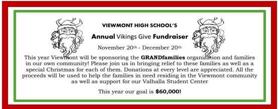 Viewmont High SchoolThis year Viewmont will be sponsoring Grandfamilies Organization and families in our own community. Please join in bringing relief to these families and a special Christmas to each of them. Donations at every level are appreciated! All of the proceeds will be used to help these families and other families in need in the Viewmont Community as well as support and supply our Valhalla Student Center.