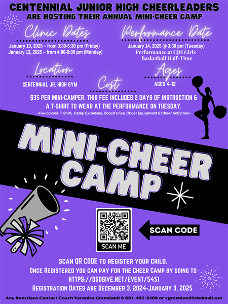 Centennial Jr HighCentennial Jr High Cheerleaders are hosting their annual Mini-Cheer Camp! Camp is open to girls ages 4 to 12 years old. Cost of camp is $35 and includes a t-shirt and poms for participant, and covers camp expenses, coach's fee, cheer equipment & activities. Please remember to register your child using the QR Code and include child's name in the payment comments. Contact Coach Greenland with any questions you may have. 801-402-0108 or vgreenland@dsdmail.net