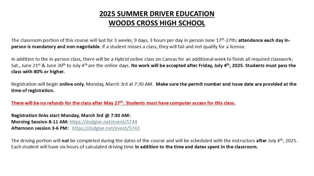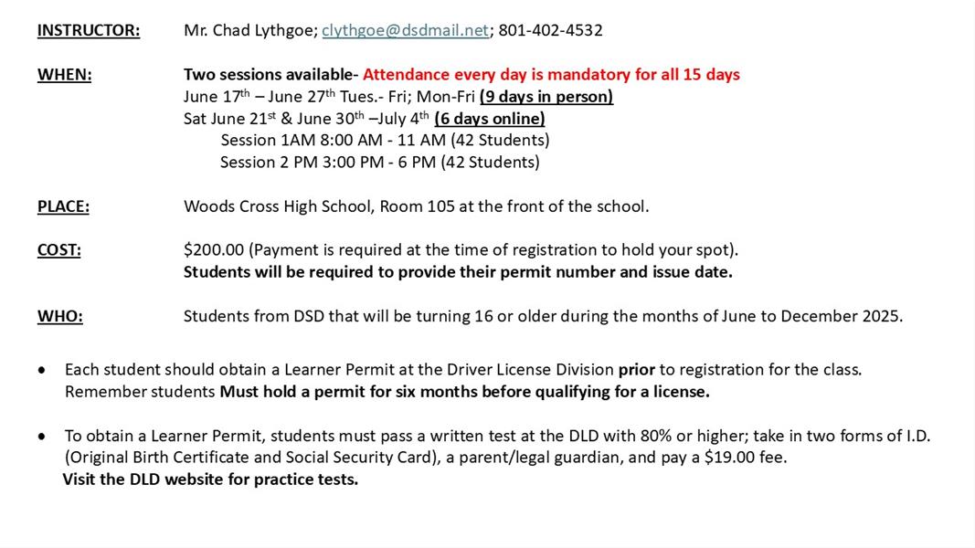 Woods Cross High SchoolAFTERNOON Session June 17th-July 4th 3:00-6:00 pm *Hybrid Course, 9 days in-person and 6 days online* Students must have a valid Learner Permit before enrolling in this class. YOU MUST ENTER THE PERMIT NUMBER AND ISSUE DATE IN THE COMMENT SECTION UPON CHECK OUT OR YOU WILL NOT BE GUARANTEED A SPACE IN THE CLASS!!! -Attendance each day is mandatory and non-negotiable. -Students will sign up for the driving groups during class-No refunds after May 27th. ****DO NOT PAY TWICE, PLEASE CALL THE OFFICE 801-402-4500 IF YOU HAVE LEFT OFF THE PERMIT NUMBER**** **See Flyer for more info**