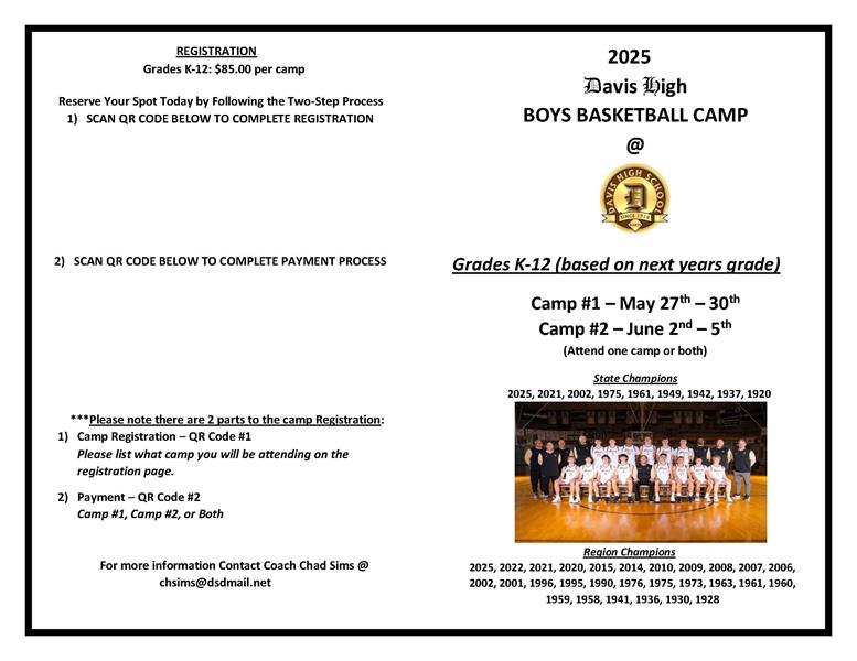 Davis High SchoolDHS Boys Basketball Summer Camp Fundraiser. Come get instruction in basketball fundamentals by the Davis High men's basketball staff and current team members in. Shooting, Defense, Ball Handling, Rebounding, Team Strategies, 1 on 1 Competition, Free Throw Competition, & 3-point Competition. (Fees will be used to offer water, camp shirts, stipends for coaches, & misc. costs) Grades K-12: Two camps May 27th - May 30th & June 2nd - June 5th. You can attend both camps! Grades 6th-8th 8:30-10:00 am Grades 3rd-5th 10:00-11:30 am Grades K-2nd 11:30 am-1:00 pm All proceeds will benefit the Davis High Boys Basketball Program. Please complete registration and fee paid asap to make sure you have a spot reserved. Scan QR Code to Register