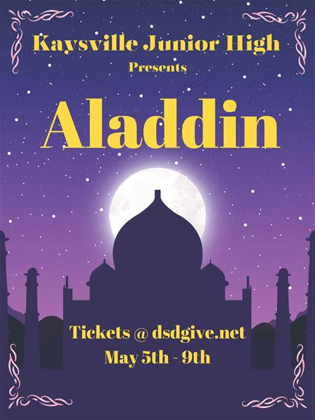 Kaysville Junior High Theatre presents a fantastical night in the city of Agrabah! Join Aladdin, Jasmine, and their friends on a journey of finding treasure, comradery, and maybe a little bit of romance. May 5th - 9th at 7:00 PM