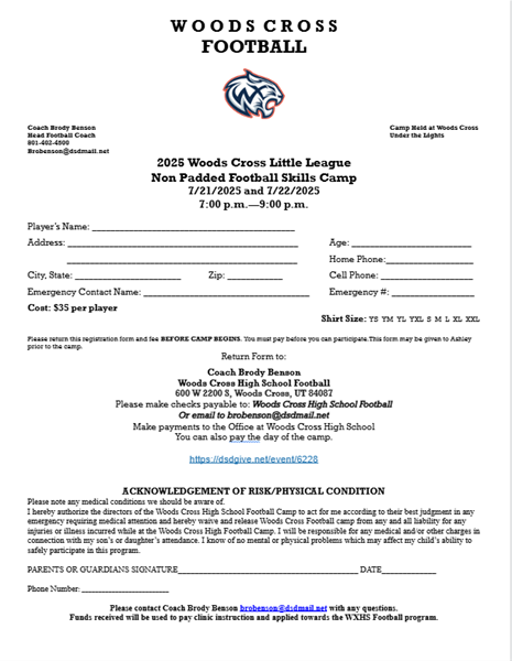 Football Little League Non-Padded Skills Camp IN COMMENTS PLEASE PROVIDE: Players name and T-shirt size Coach Benson email brobenson@dsdmail.net *See Flyer for information**