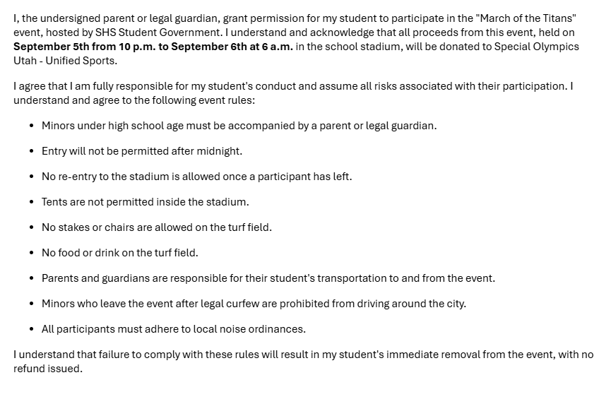Syracuse High SchoolMarch of the Titans is an all-night fundraiser walk with all proceeds going to the Special Olympics Utah - Unified Sports, including our own Syracuse High School Unified Sports Teams. This is a community event - everyone is invited to participate to support our local community. Date: Friday, September 5 @ 10 pm until Saturday, September 6 at 6 am Registration is $15 per person and will include a March of the Titans event tee shirt
