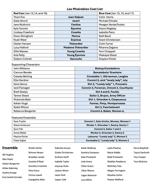 Layton High SchoolLHS presents Les Misérables with a live orchestra at Clearfield High School. January 12-17, 2026, at 7pm. Sent to jail for stealing a loaf of bread in 19th-century France, prisoner Jean Valjean earns his release after 19 years of imprisonment only to find a world unwilling to give him a second chance. Tickets are 8 dollars and general admission.