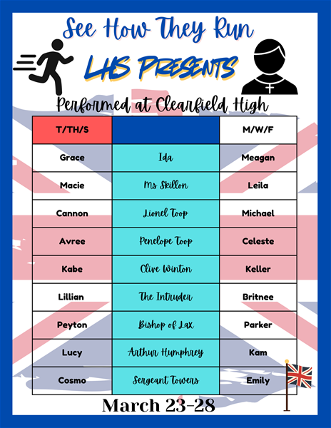 Layton High SchoolLHS Actors Company presents "See How They Run" at Clearfield High's Little Theatre March 23-28 at 7pm. In an English vicarage, the vicar and his wife are overwhelmed by a barrage of colorful guests, including an American actress, an American G.I. stationed with the Air Force in England, a cockney maid who has seen too many American movies, an old dowager who “touches alcohol for the first time in her life,” a sedate Bishop aghast at all these goings-on, and four men in identical clergyman suits, one of whom is an escaped prisoner. Tickets are 8 dollars and general admission. Seating is limited and tickets will be unavailable once sold out.