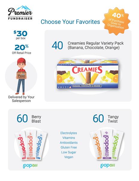 Boys soccer fundraiser - $30 per box - choose a box of 40 creamies (variety pack) or a box of 60 popoffs (Berry Blast or Tangy Twist)