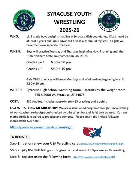Syracuse High SchoolPK-9 grade boys and girls that live in Syracuse High boundaries. Kids should be at least 5 years old. Only advanced 4-year-olds should register. All girls will have their own separate practices. Boys will practice Tuesday and Thursday beginning Nov. 4 running until the Utah Northern State Tournament on Jan. 23-24. Girls ONLY practices will be on Mondays and Wednesdays beginning Nov. 3. 5:30-6:30 pm. See Flyer for more information.