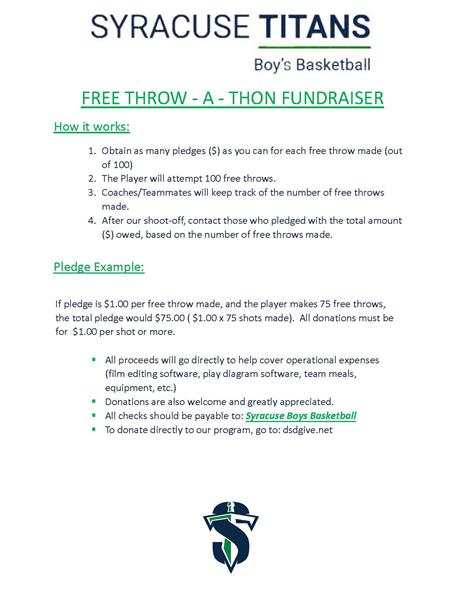 Syracuse High SchoolFREE THROW - A - THON FUNDRAISER How it works: 1.Obtain as many pledges ($) as you can for each free throw made (out of 100) 2.The Player will attempt 100 free throws. 3.Coaches/Teammates will keep track of the number of free throws made. 4.After our shoot-off, contact those who pledged with the total amount($) owed, based on the number of free throws made. Pledge Example: If pledge is $1.00 per free throw made, and the player makes 75 free throws, the total pledge would $75.00 ( $1.00 x 75 shots made). All donations must be for $1.00 per shot or more. All proceeds will go directly to help cover operational expenses(film editing software, play diagram software, team meals, equipment, etc.) Donations are also welcome and greatly appreciated. All checks should be payable to: Syracuse Boys Basketball. To donate directly to our program, go to: https://dsdgive.net/event/5208 Please see below flyer for more information.