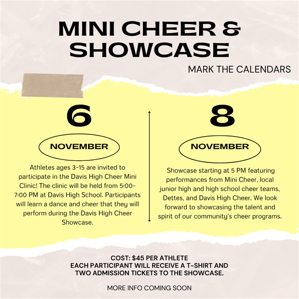 Davis High SchoolAthletes ages 3-15 are invited to participate in the Davis High Cheer Mini Clinic! Participants will learn a dance and cheer that they will perform during the Davis High Cheer Showcase on November 8, 2025. Showcase starting at 5:00 pm. featuring performances from Mini Cheer, local junior high and high school cheer teams, Dette's, and Davis High Cheer. We look forward to showcasing the talent and spirit of our community's cheer program. Funds raised will go towards the Davis Cheer National Competition. Clinic Date: November 6 The Clinic will be held from 5:00-7:00 p.m. Please follow this QR Code to register. You must register in order to participate.