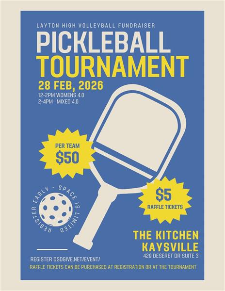 Layton High SchoolPickleball Tournament at The Kitchen Saturday, February 28th from 12:00 - 4:00pm Women's 4.0 (12-2pm) Mixed Doubles (2-4pm) $50/team, sign up for 1 of 2 divisions/time slots. Please comment your name, partners name, which division (women's or mixed), phone number and name of athlete you're supporting. Thank you for supporting the 2025-2026 Layton High Boys Volleyball team. Your donation will go towards helping with team fees. We are excited about our volleyball team this year. We appreciate your support. GO LANCERS!!