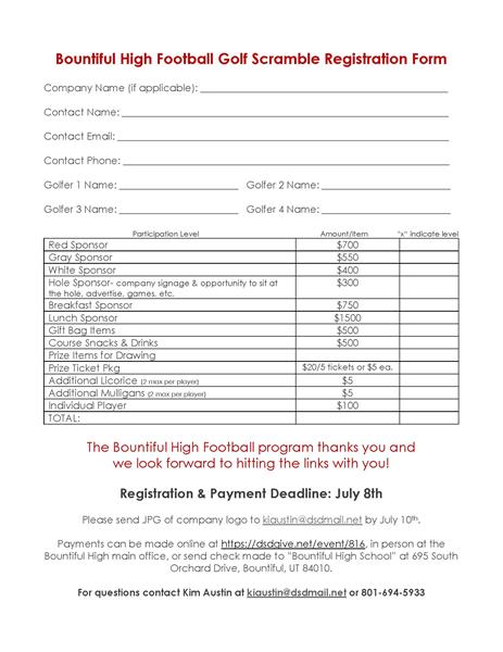 Bountiful High SchoolCome spend a beautiful day at Bountiful Ridge Golf Course hackin' away while supporting Bountiful High Football! The Golf Scramble is on July 22nd with a 7:30 a.m. shotgun start! All proceeds go to the Bountiful High Football program and its student-athletes. The sponsorship levels are as follows: RED SPONSOR - $700.00 Includes green fees, carts, breakfast and lunch for 4 players Company signage on a hole Company name announced at all 2020 home football games Sandbagger package* GRAY SPONSOR - $550.00 Includes green fees, carts, breakfast and lunch for 4 players Company signage on a hole Sandbagger package* WHITE SPONSOR - $400.00 Includes green fees, carts, breakfast and lunch for 4 players Sandbagger package* *Sandbagger package includes 1 licorice rope per team, 4 mulligans per team and 2 prize tickets per player. Individual golfers are welcome for $100.00 which includes breakfast and lunch We will place you in a foursome. Other sponsorships are available: Breakfast - $750.00 Lunch - $1500.00 Gift Bag Items - $500.00 Course Snacks/Drinks - $500.00 Hole Sponsor - $300.00 We are also accepting prizes for Contests and Giveaway. Please contact Kim Austin at (801)694-5933 or kiaustin@dsdmail.net to donate. Fill out the attached registration form and email to Kim Austin at kiaustin@dsdmail.net or turn in to the Bountiful High main office. REGISTRATION AND PAYMENT DEADLINE: JULY 8TH