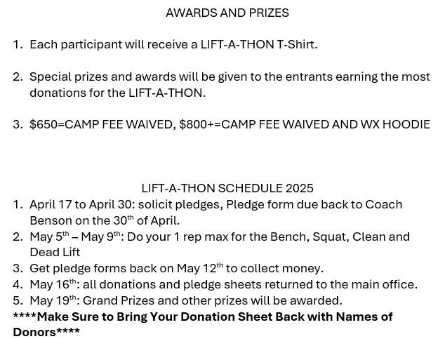 Sponsor a WXHS Football player by making a donation to the Lift A Thon. The lifts to be performed for the LIFT-A-THON will be the Bench Press, Squat, Power-Clean and Dead Lift. LIST THE PLAYERS NAME IN THE COMMENT BOX AT CHECK OUT.