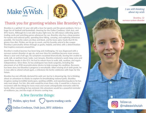 Davis High SchoolWish Week: Save It or Shave It for Kids Like Brantley During Wish Week, our school is raising funds for Make-A-Wish Utah to help grant life-changing wishes for children facing critical illnesses. This year, we are honored to be represented by Brantley, a courageous 12-year-old whose strength, kindness, and determination inspire our entire community. One of our biggest events of the week is Save It or Shave It. Students are paired head-to-head in a friendly fundraising competition, racing to raise the most money to save their hair. The student who raises the least must make a drastic hair change—either shaving their head or cutting their hair short if it is long. While the haircuts may be bold, the cause is even bigger. Every dollar raised goes directly to Make-A-Wish Utah, helping grant wishes for children across the state—kids like Brantley who deserve moments of joy, hope, and unforgettable memories. Names of competitors are: Payson Wright Bon Baker Taylor Hayford Lexie Ban Etten Shaylee Niederhauser Ezra Lloyd Anna Gibby Natalie Ungerman Josef Glaze Jaxon Gallup Mckay Barker Noah Hess Boston Price Graham Meece Donations for this one need to close at noon on Friday.